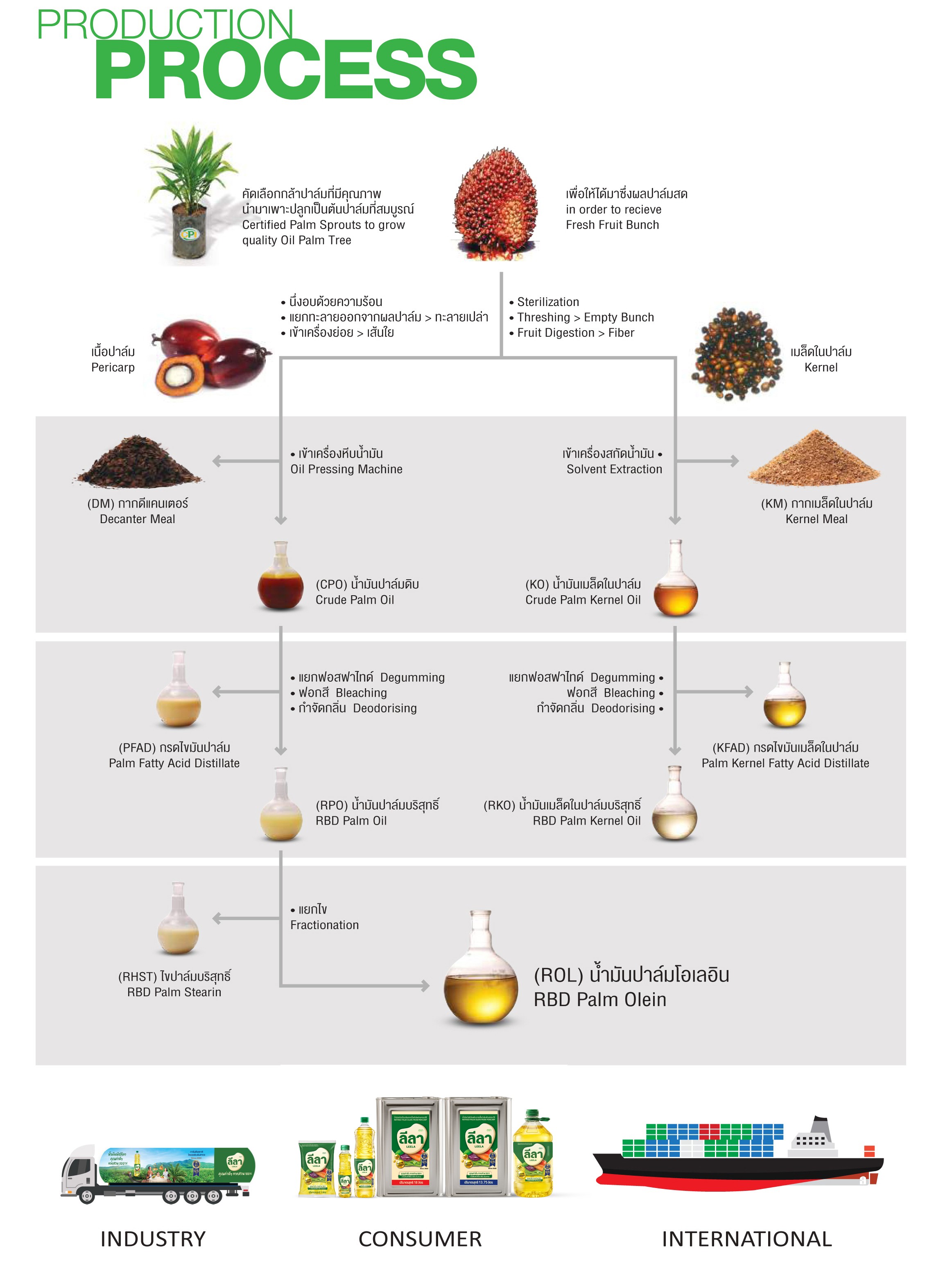 น้ำมันปาล์มโอเลอินที่ได้หลังจากผ่านกรรมวิธีในการผลิตและตรวจสอบคุณภาพตามระบบมาตรฐาน จะถูกส่งเข้าถังเก็บเพื่อรอส่งมอบ ส่วนหนึ่งจะถูกส่งเข้าโรงบรรจุทันสมัยของบริษัทฯ ซึ่งสะอาดและปลอดภัยก่อนส่งไปจำหน่ายให้กับผู้บริโภคทั่วประเทศในรูปแบบของน้ำมันปาล์มโอเลอินผ่านกรรมวิธีบรรจุขวด ปี๊บและถุง ภายใต้ตราสินค้า "ลีลา" หลังจากผ่านกระบวนการผลิตและตรวจสอบคุณภาพสินค้าตามระบบมาตรฐานสินค้าจะถูกจัดส่งไปยังผู้บริโภคทั้งในและต่างประเทศ โดยบริษัทฯ สามารถส่งมอบสินค้าผ่านรูปแบบการจัดส่งประเภทต่างๆ อาทิ รถขนส่ง Tanker สำหรับกลุ่มลูกค้าอุตสาหกรรมต่างๆ ที่ต้องการสินค้าในลักษณะ Bulk Supply, รถขนส่ง Truck สำหรับกลุ่มลูกค้าคอนซูมเมอร์ รวมถึงการส่งมอบโดยเรือบรรทุกน้ำมันสำหรับการส่งออก เพื่อตอบสนองความพึงพอใจของลูกค้าในทุกกลุ่มธุรกิจ